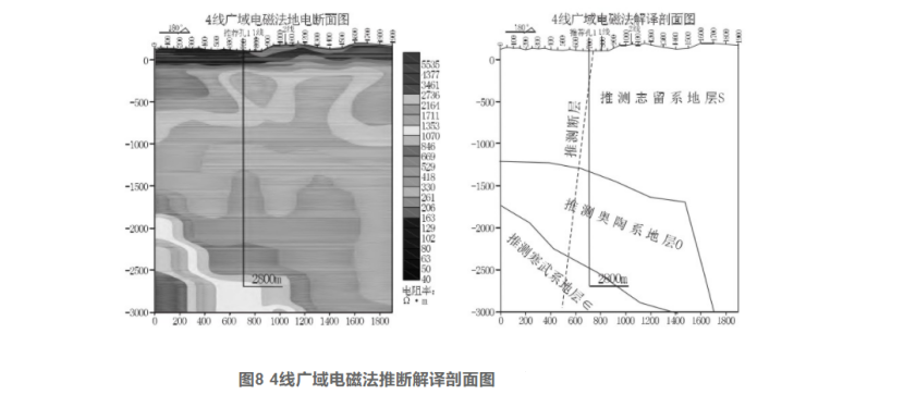 (3)各地層厚度及電阻率特征,志留系(S)地層電阻基本小于500Ω·m,厚度900-1800m;奧陶系O地層電阻率400~900Ω·m,厚度大于300 m,向南西側厚度急劇增大;寒武系∈地層電阻率基本大于900Ω·m,根據斷裂構造發(fā)育、裂隙發(fā)育等因素影響呈現(xiàn)不同電阻率,厚度未揭穿。